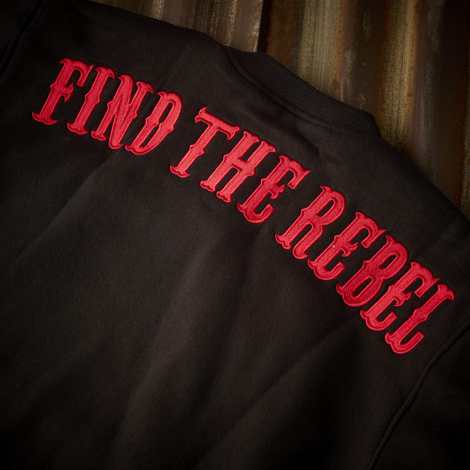 On the back: “Find A Rebel” – stitched large across the shoulders, for those who ride their own path.